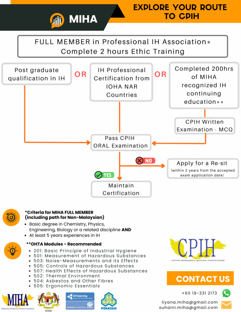 The Certified Professional Industrial Hygienist, CPIH, is part of MIHA’s initiatives towards achieving the highest standard of Industrial Hygiene practice in Malaysia.