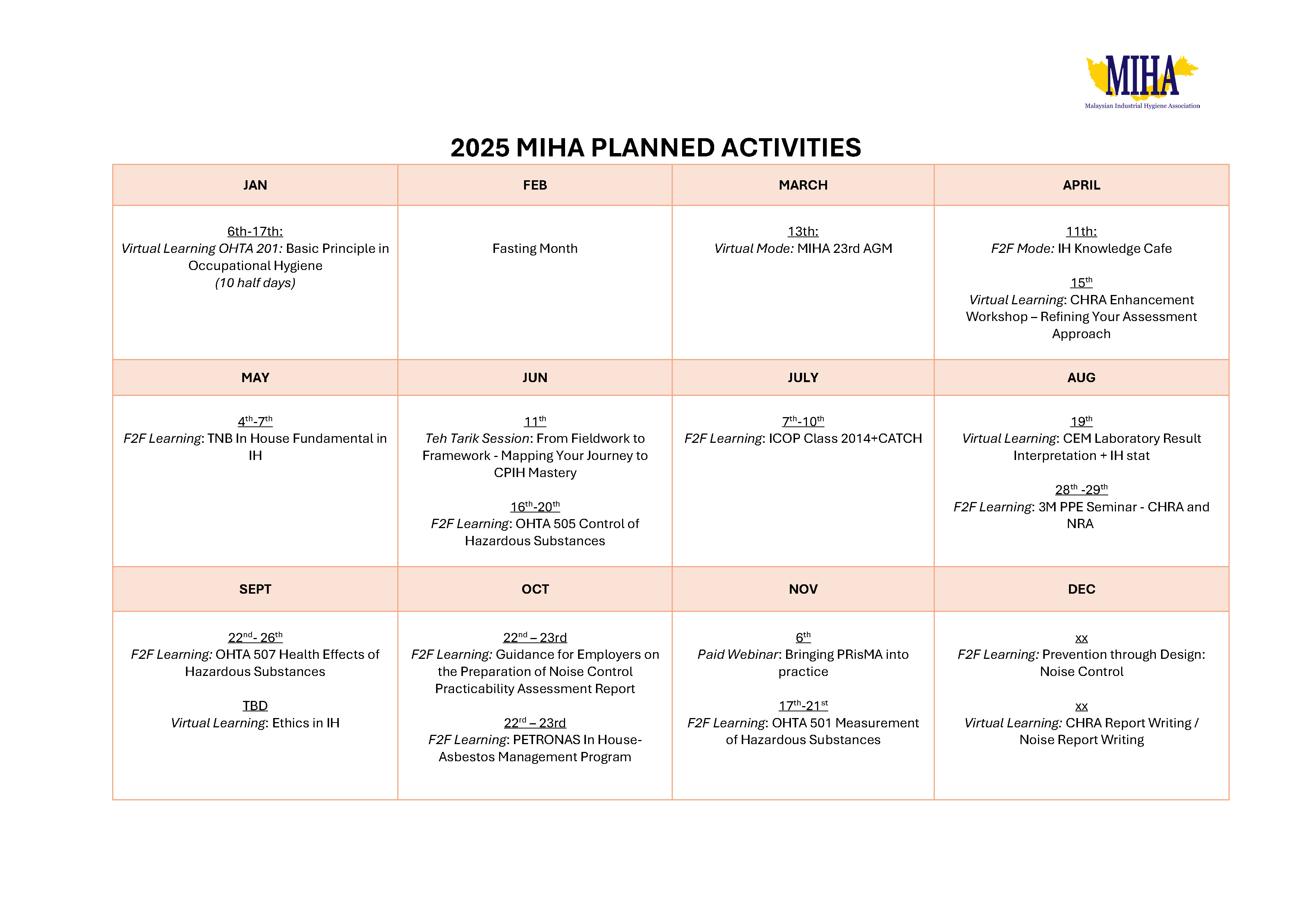 Training Calendar 2025